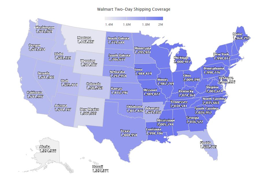 沃尔玛作为全美最大的零售商,拥有近5000家门店和近10家电商物流中心,都还不能实现免费的两天送货服务。如下图所示,沃尔玛有200万件产品可以让东部沿海地区客户享受2天发货服务,但这一数据在西海岸却只有160万件产品,减少了20%。在蒙大拿州或怀俄明州等州,只有150万种产品才能享受两日达服务。