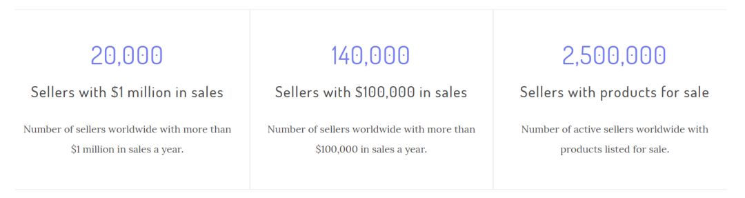 据报告显示,目前亚马逊在全球拥有超过200万的卖家。平台规模庞大已经众所周知,但该平台规模大并不仅限于卖家数量庞大,还有更好的衡量指标,包括全球有2万卖家销售额在100万美元及以上,有14万卖家销售额在10万美元及以上,平台有250万活跃卖家: