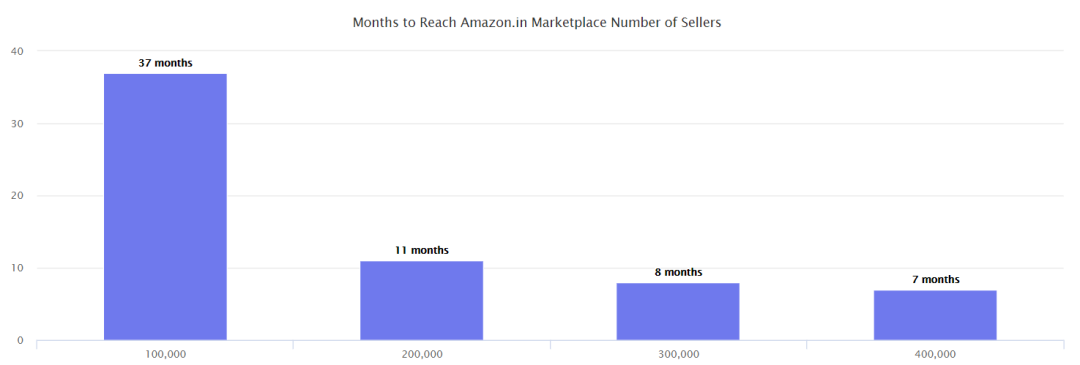 亚马逊花了4年时间才将印度站从0卖家“拉扯”至20万卖家,但仅仅用了一年多的时间将数量翻了一番。亚马逊印度站于2013年6月推出,并花了37个月的时间,于2016年7月实现了第一个里程碑,吸引了10万卖家入驻。接着,又花了11个月时间,于2017年6月让卖家数量翻了一番,达20万。自那以后,卖家数量就开始猛增,8个月内(至2018年2月)飞速增至30万卖家,并仅在7个月后(2018年9月),卖家数量就突破了40万。