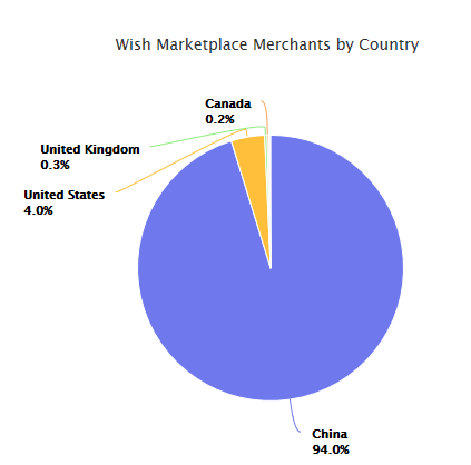 Wish成为有数十万卖家的平台,但由于它重点打造是低价产品,提供方便和高质量产品。因此几乎所有(94%)卖家都来自中国。美国占4%,英国占0.3%,加拿大占0.2%,印度占0.1%,澳大利亚占0.1%。其余的分布在世界各地。即使是在国际卖家中,也有许多人都在卖中国制造的商品。