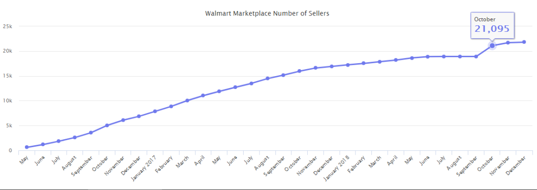沃尔玛平台卖家已经超过了2.1万。2018年又有近5000名新卖家加入沃尔玛平台。该公司预计到2018年底,美国电商销售额达160亿美元,同比去年增长40%,其中主要是来自平台的销售额,但目前不清楚沃尔玛平台贡献了多少GMV。以下是沃尔玛平台卖家数量增长数据: