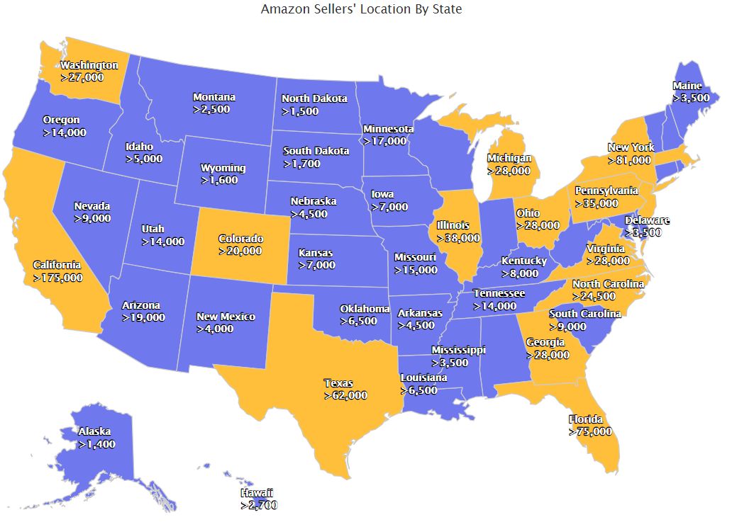 此外,报告还显示,有超过100万美国的中小企业在亚马逊上销售产品。美国本土卖家大多来自加利福尼亚州,占所有美国卖家的18%,他主要来自纽约、佛罗里达和德克萨斯等州。这四个州的亚马逊美国卖家占整体的40%。以下是亚马逊美国卖家分布图: