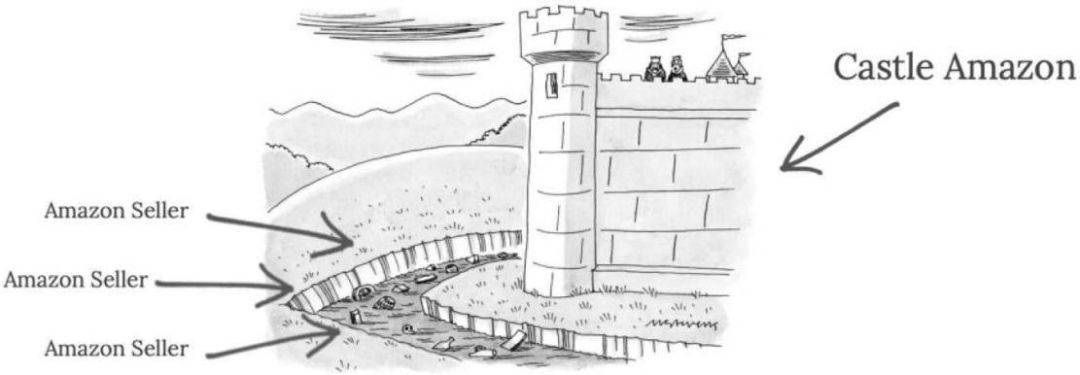 从整体来看,亚马逊的生态系统看起来确实像一座由牢不可破、由卖家这条“护城河”保护起来的城堡,而沃尔玛和eBay,没有“护城河”。因为他们没有亚马逊的基础设施:Prime和FBA。即使亚马逊继续打压一些卖家,改变政策,或增加费用,护城河也只会随着更多卖家的加入和更多的消费者加入Prime会员而加深。