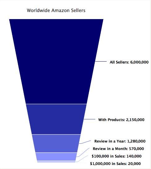 如下图所示,从亚马逊全球卖家“漏斗”中,可以看到,最上层显示亚马逊有超过600万卖家,但销售额在100万美元或以上的卖家只有2万名,这底层2万名卖家正是推动亚马逊销售额增长的主力军。