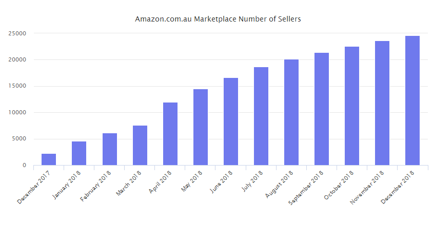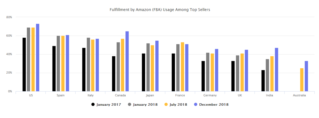 在所有亚马逊站点上, FBA发货卖家数量都在增加。2018年2月26日,亚马逊澳洲站也推出了FBA服务。之后10个月内,亚马逊澳洲站FBA发货卖家比例增长至33%。