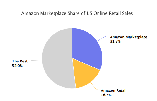 报告显示全美最大的在线零售商并非亚马逊本身,而是亚马逊平台上的卖家。据 eMarketer 估计,2018年,亚马逊上数百万卖家的电商销售额占美国电商总销售额的 31.3%,接近亚马逊自营的2倍,具体数据如下图所示: