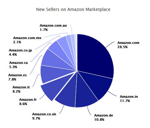 大部分亚马逊的新卖家主要入驻美国站、印度站和德国站等站点销售(如下图),但他们中只有极少数才会成为亚马逊活跃卖家,许多新卖家甚至连一个产品都没有上架过。