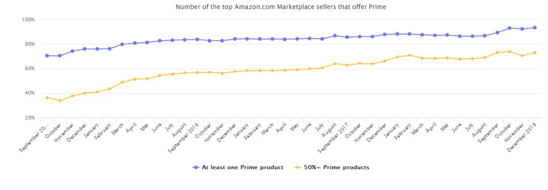 如下图所示,为买家提供Prime产品的卖家数量稳步增长。2018年,有超过90%的Top卖家现在至少销售一种Prime标志产品,高于3年前(2015年)的70%。此外,73%的Top卖家销售的产品中有超过一半符合Prime资格,高于3年前的40%。卖家选择将库存存储在亚马逊的物流中心中并不仅仅是因为更方便或更便宜,而是通过FBA发货可以借助亚马逊上打开消费者渠道。几年来,那些FBA发货卖家往往因为有Prime标志而比其他卖家更成功。