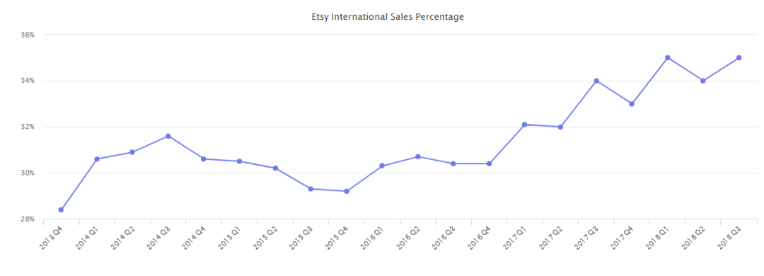 2018年,Etsy在美国以外的国际市场上取得了进步。Etsy首席执行官Josh Silverman在Q1电话会议上表示,该公司的国际商品交易总额占总商品交易额的50%。国际商品销售总额是指美国之外的卖家和买家产生的交易额。这一数据在Q2和Q3也是如此。