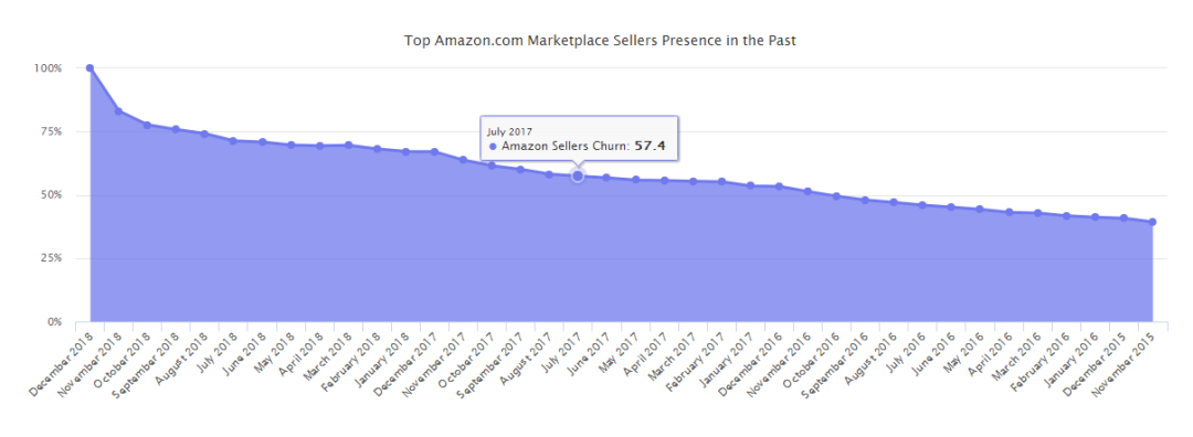 如下图所示,分析下目前亚马逊Top卖家中,在1年前是Top卖家的有近67%;在2年前是Top卖家的有53%;在3年前是Top卖家的有41%。相对较低的卖家流失率凸显了卖家们对亚马逊的长期依赖。