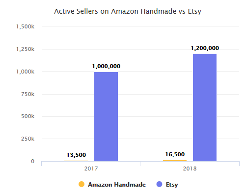 目前,Etsy有超过120万卖家,销售多达5500多万种产品。Amazon Handmade的销量超过1.65万。一年内,在Etsy上上架产品的卖家数量增加了20万,而在亚马逊Handmade上仅增加3000家。只有1.3%的Etsy卖家同时在Amazon Handmade上销售产品。
