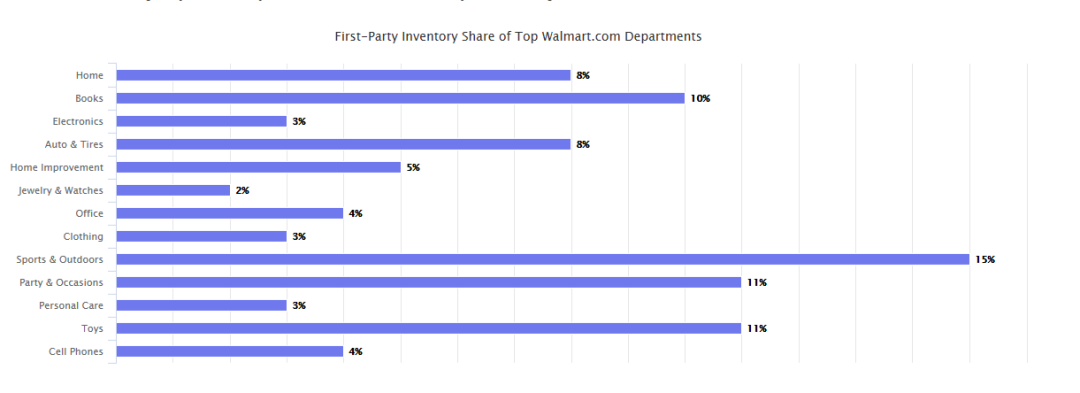 家居用品、书籍、电子产品和汽车&轮胎是沃尔玛平台上的主要产品类别。家居类拥有近1200万种产品,是产品最多的品类。此外,如下图所示,在沃尔玛畅销品类中,沃尔玛自营产品的份额还是有一定差异的:
