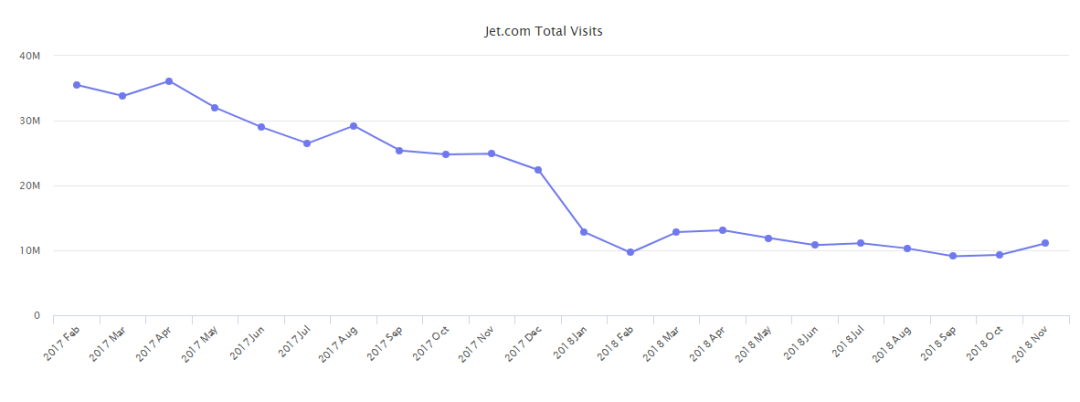 自从2016年8月沃尔玛收购Jet.com起,Jet.com访问量逐月增加,并在2016年夏季达到了峰值。但从以后,Jet.com的访问量就逐渐下降,如下图所示: