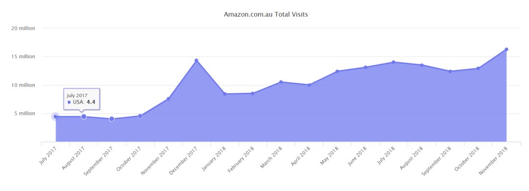 目前亚马逊澳洲站已经分别给卖家和买家提供了FBA物流服务和Prime会员服务。在推出之前,亚马逊澳洲站每月能吸引400万至500万访客,推出后访问量也一直稳步增长。2018年以来,亚马逊澳洲站的流量翻了一番。据SimilarWeb数据显示,2018年11月访客最多,达到1630万,超过了2017年12月的访问量,创下历史新高。