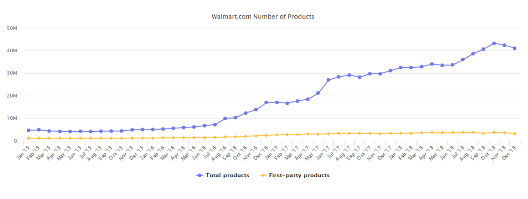沃尔玛平台共有超过4200万种产品,但沃尔玛自营仅有350万种,其余的均来自平台卖家。在短短3年时间内,沃尔玛利用平台将产品范围扩增了10倍:从2015年1月的450万种产品增长到2018年12月的4200万种产品。