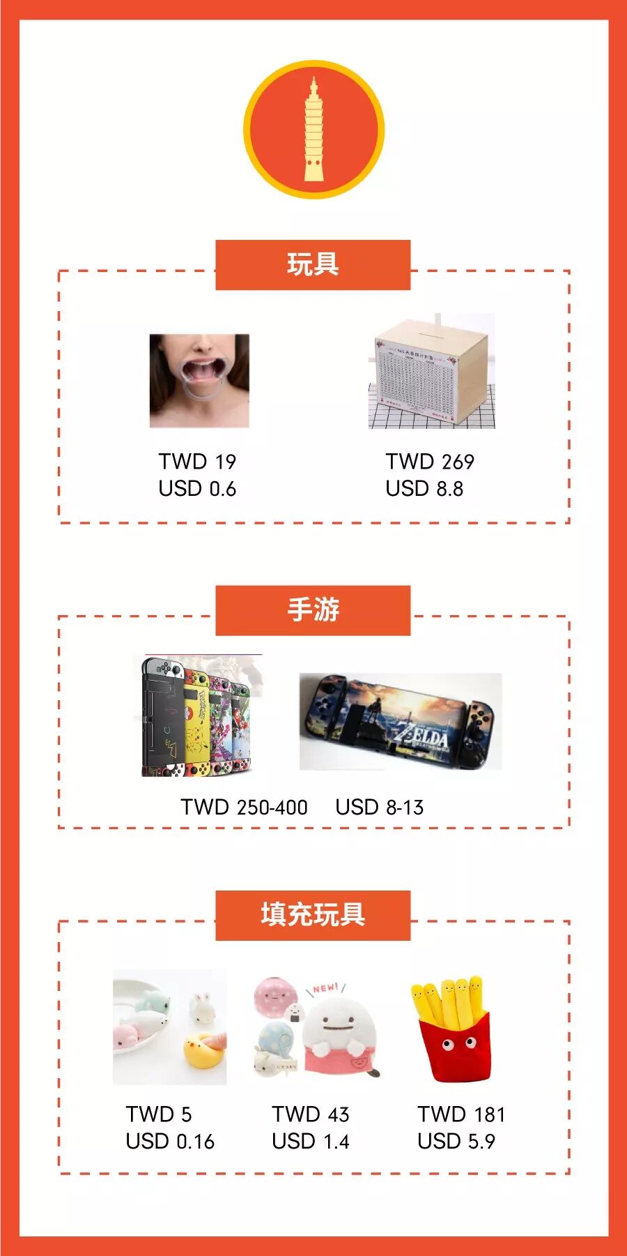 在台湾市场,游戏及爱好类目的单量相对较高但增长速度一般。手游相关、玩具、填充玩具是较为值得关注的子类目。其中,手游相关商品单量增速明显,过去三个月的SKU出单效率极高,短期内有望快速成长。以下为热卖款式,请参考: