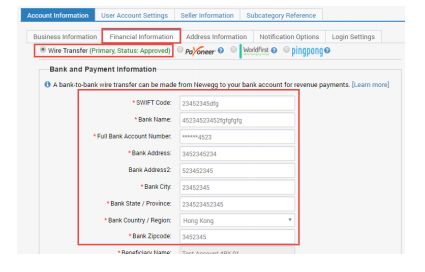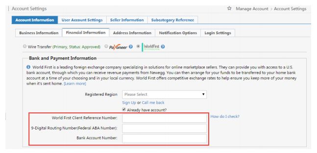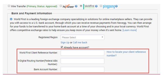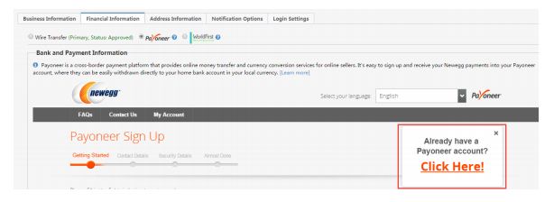 这是一篇来自商家心底呐喊的文章。 没有国际银行账户不能收取国际货币怎么办? 想要用国际汇款方式收取货款但是提供不了相应文件怎么办? 此时此刻聆听到了各位商家们心底的呼喊,答疑超人蛋蛋酱来解救大家啦! 其实为了能够持续不断地为卖家提供尽可能优质的体验,Newegg商城已经与三个知名的国际付款和货币兑换服务提供商 Payoneer、 World First和 PingPong 建立了合作关系,他们将支持我们的国际卖家将Newegg账户的资金以当地货币提款至卖家的本地银行账户。 请按照下列步骤设置新的付款方式。 *目前 Newegg Canada Marketplace 不支持 World First 和 PingPong 服务 国际卖家可以选择的付款方式有以下两种: 1.银行到银行的电汇转账 2.第三方国际汇款服务 (1)Payoneer (2)World First (3)PingPong 注意事项:Newegg国际商城卖家账户如果没有选择有效的付款方式将无法激活。如果使用银行到银行的电汇转账,那么Newegg可以通过银行到银行的电汇转账将付款直接转入您的银行账户。(详情点击这里) 1. 登陆 Seller Portal,进入 Manage Account > Account Settings > Financial Information 选项。 2. 在卖家注册时或通过 Newegg Seller Portal 填写您的国际银行账户。 3. Newegg将会验证卖家身份以确保您可以准确收到付款。 4. 您的销售收入将会由Newegg存入您的银行账户。 Payoneer是一个提供在线汇款及货币兑换服务的跨境支付平台。在 Payoneer 账户里,您可以轻松地从国内银行账户以本地货币直接提取您的付款。 操作步骤: 1. 登陆 Seller Portal,进入 Manage Account > Account Settings > Financial Information 选项。 2. 您可以查看当前银行和付款信息设置。在您准备好更换付款方式后,点击“EDIT”按钮开始设置。 3. 点击旁边的单选按钮选择 Payoneer。 有两种方式可选: (1)全新注册 (2)使用已有的 Payoneer 账户 Payoneer全新注册步骤 1. 请按照下列步骤逐步完成注册。 2. 注册信息全部填写完成之后,会出现确认页面。注意:请务必点击“Save”按钮完成申请。 3. Newegg将会以邮件形式通知卖家申请结果。如果您的申请没有通过,请考虑其他付款方案或选择其他付款方式。 使用已有的 Payoneer 账户 1.如果您已经有 Payoneer 账户了,请点击“Already have a Payoneer Account? Click Here!” 的链接进入下一步。 2.页面会显示 Payoneer 的登录窗口。请进行登录并进入下一步。 3. 在账户认证提交之后,会出现确认页面。注意:请务必点击“Save”按钮完成申请。 World First 是一家领先的外汇公司,专门为在线商城卖家提供解决方案。World First 提供有吸引力的汇率,确保您在将资金转入国内银行的过程中节省更多成本。 操作步骤: 1. 登陆 Seller Portal,进入 Manage Account > Account Settings > Financial Information 选项卡 2. 您可以查看当前银行和付款信息设置。在您准备好更换付款方式后,点击“EDIT”按钮开始设置。 3. 点击旁边的单选按钮选择 World First。 有两种方式可选: (1)全新注册 (2)使用已有的 World First 账户 World First全新注册步骤 1. 先从下拉列表中选择您有商业往来的国家。 2. 有两个选择可以进入下一步。 <1>注册。点击“Sign up”,页面会重定向到 World First 的官方网站,然后进入下一步。 <2> Call me back (回电服务)。如果您想要 World First代理与您联系以完成注册,请选择“Call me back”选项并在 World First 官方网站留下您的联络方式。 3.注册完成之后,您将会收到以邮件形式发送的World First Client Reference Number。(World First Client Reference Number是分配给所有在 World First 注册的新用户的唯一编号) 注意:您也可以登陆您的 World First 账户并在 Details 模块下选择 My Profile 来查看您的 World First Client Reference Number。 4. 在 Seller Portal 的 World First 页面下填写 World First Client Reference Number 以及银行账户相关信息以完成付款方式设置。 5.Newegg将会以邮件形式通知卖家申请结果。如果您的申请没有通过,请考虑其他付款方案或 选择其他付款方式。 使用已有World First账户 1.如果您已经有 World First 账户了,请在 Seller Portal 的 World First 页面下填写 World First Client Reference Numbe 以及银行账户相关信息。 2. 点击“保存”按钮提交您的请求。Newegg 将对您的商家账户配置文件与 World First 账户持有者信息相匹配来验证输入的身份。Newegg将会以邮件形式通知商家请求结果。 如果您的请求不被接受,请直接与WorldFirst 联系以获取更多详细信息。 PingPong是一个创新的全球支付服务商,为中国跨境电子商务客户的需求提供快速、符合成本效益的合规支付解决方案。PingPong 的支付解决方案使电子商务卖家能够接收从全球在线商城到他们本地银行账户的付款。 操作步骤: 1.登陆 Seller Portal,进入 Manage Account > Account Settings > Financial Information 选项。 2.点击旁边的单选按钮选择 PingPong。有两种方式可选: (1)全新注册 (2)使用已有的 PingPong 账户。 PingPong全新注册步骤 操作步骤: 1.输入您的邮箱地址并勾选复选框同意 PingPong 服务协议。 2.点击“确认注册”按钮提交请求。重要提示:请务必点击“SAVE”按钮完成申请。 3.注册请求提交之后,您将会收到 PingPong 发送的跟进邮件。 请注意:如果您在几分钟内没有收到邮件,请查看您的垃圾邮件文件夹以确保您的邮件没有被过滤。 4.点击“继续注册”按钮。您将被重定向到 PingPong 的注册页面。 5. 完成填写注册表格后提交请求。PingPong 需要至多 48 小时来处理您的请求。在处