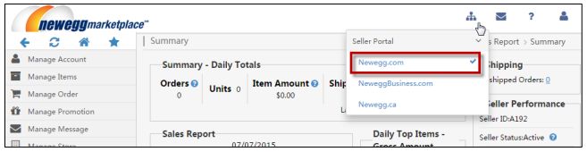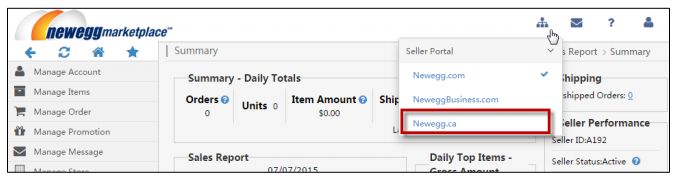 请注意:下列步骤是在 Newegg Canada marketplace 的账户中进行的。相同的步骤也可以应用于其他两个平台: