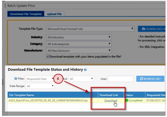 在 Download File Template Status and History 模块,点击 Download 链接保存文件到您的电脑。