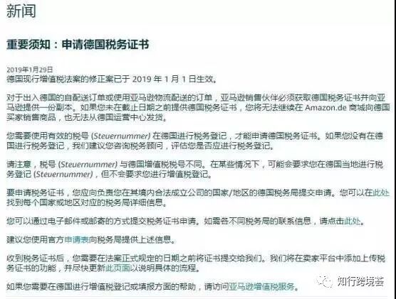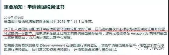 年前,不少卖家收到亚马逊官方邮件,其内容大致为:对于出入德国的自配送订单或使用亚马逊物流配送的订单,亚马逊卖家必须获取德国税务证书并向亚马逊提供一份副本。