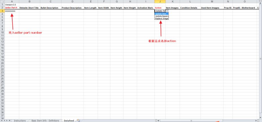 打开文档后,我们可以看到有两列是必填项,seller分别需要填写seller part number和action。