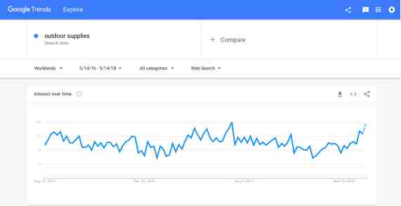 无论什么季节、什么天气,职业运动员和户外活动爱好者都会在户外活动。但是除了这一小部分客户,还有大部分人选择在晴朗的日子出游。而随着天气变暖,越来越多的人会选择户外出行。下图为过去两年内户外用品的谷歌搜索量: