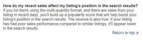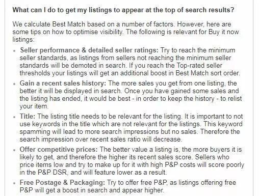 eBay对Best Match的解释: The objective of Best Match is to show the most relevant, best value items from sellers that will create a fantastic experience for the buyer. 当我们在上传新产品时,可能无法出现在搜索结果页面的最前面。原因是:我们的新品缺少eBay考量产品相关性的关键指标-近期销售订单 如何去匹配这个排名规则并让自己产品出现在eBay产品排序靠前 我们从eBay官方解释里面可以了解到: eBay提到了5个关键参数用于确定产品相关性,进而对产品进行排序,我们直接提取关键词分析: 1.卖家账户绩效和店铺评价 2.近期销售情况 3.标题关键字匹配 4.产品价格 5.是否免运费 这里有一个最关键的指标eBay是暂时没办法知道的,那就是这个产品的近期销售订单。 我从eBay的官方FAQ里得到了关于近期销售对于产品排名的影响: 从中我们可以得到几个结论: 1.多属性产品比单属性产品排名更优 2.出过单的产品排名比没出单的排名更优 3.出单多的比出单少的产品排名更优 所以结论是: 利用价格排序来确保我们的eBay产品有足够的曝光量 虽然这通常意味着要亏本销售,不赚钱,但几乎可以在当天完成第一单,而这个行为也会提高产品的Best Match排名。 注意:价格提升到行业水平即可,如果价格太高会导致你转化率低,排名无法保持很久。 关于eBay最佳匹配算法的额外说明: 上面所讲到的方法必须要满足所有除“近期销售”外的四个条件才能达到最好效果。 1.账号绩效是前提,所以尽可能的不要让买家给差评 2.标题中包含精准关键词 3.具有竞争力的价格(不一定要最低) 4.提供Free Shipping或者本土发货,跨境电商以后应该是由海外仓主导了。 下面我们继续学习了解一下 用来让eBay新品出单的简单方法以及各种优化: eBay产品优化一:优化带有相关关键词的标题 标题是为买家建立而并非是搜索引擎。 带有相关精准关键词的标题往往被买家点击的次数更多,从而提高商品的转化率。 应该大都数卖家都知道精准词标题的重要性,那它是如何帮助我们来优化产品的呢? 转化率大家都知道怎么算,比如访客100个,有1个成功购买,那么就是1%的转化率,2个就是2%转化率。 转化率越高,eBay的搜索引擎就越会认为你的产品越好,eBay搜索引擎则会提高你的产品排名。 所以这里需要大家做的是:尽可能多的使用精准关键词而不是那些虽然热门但是毫不相关的关键词,比如买家搜索“summer chiffon dress”,而你把针织裙产品的标题里面放入这个关键词,自然你的产品点击率会很低,自然就没有转化率。 那么eBay就是慢慢降低你的产品排名。有些不懂的人就会这么做,很不负责任的! eBay产品优化二:填写产品详细参数 很大一部分人在eBay上搜索产品时,都会使用左侧的产品过滤器选项。 为什么eBay产品参数很重要? 一个关键词的搜索结果往往有几十万甚至上百万(比如上图中我筛选之前的产品数量是56827个),买家是没有那么多精力去一个个浏览的。所以为了缩小搜索范围(买家会从左边的条件选项一步步缩小产品搜索范围)。 这个时候,如果你没有设置产品参数,那么你的产品会从这些搜索结果中消失。 如果添加产品详细参数? eBay产品优化三:学会铺关键词 关键词是用户找到你的重要方式,所以我们需要在一切可以做文章的地方下功夫。下面来看看我们可以在哪些地方设置关键词。 1.eBay主页介绍 eBay个人资料页取代了以前的about me页面,如果你的是卖家那么我们可以在个人资料页里填写一些可以介绍自己店铺的描述文字。这里也是大家最容易忽略的地方,个人资料页我们可以向客户展示自己的店铺信息、增加信任,另外一方面我们可以把自己店铺主要产品关键词自然的放到这里,告诉eBay你的店铺属性。 一下是建立eBay个人资料页的建议: 1)上传高质量产品Logo和 2) 给访客一个关注你的理由 3) 发布关于你产品的专业知识 4) 利用好collection 2.产品描述 根据eBay官方的优化建议,产品描述至少要有200个字符。另外从seo角度,描述的首段和结尾需要自然的提到产品的主要关键词。比如现在市面上常见的关联营销模块,一般选择关联产品时候,最好选择关联性高且具有相同关键词的产品,另外我们可以适当加粗关键词。 3.巧妙使用eBay店铺 如果你有开通eBay店铺功能,那么会有额外更多填写关键词的地方。另外建议大家在每个产品描述里面添加店铺链接,当买家浏览你的产品时可能会点击进入你的店铺,这样会增加店铺总流量。 4.图片的优化 这是大多数人容易忽略的地方,我们的图片也可以添加关键词,那就是在html格式里添加图片alt属性(这样做可以让搜索引擎知道这张图片里面包含什么内容)。 一般设置图片ALT属性只需要添加产品的关键词进去即可。如果对于图片ALT不了解,可以自行搜索,很简单。 eBay产品优化四:尽可能达到eBay店铺各项指标 eBay优秀卖家这部分卖家产品流量会比一般买家的要高,相当于eBay的扶持政策。所以eBay搜索引擎Cassini会把这部分引入到排名机制中并作为一个重要的参考数据,如何成为ebay top seller? 1) 提供free shipping 2) 提供合理的退货政策 3) 快速回复客户的问题 4) 优惠的折扣 5) 有竞争力的价格 6) 发货时间不超过1天 7) 高质量优质图片 为了更好的解决各位卖家的问题和疑惑,关注公众号后台回复“SEO”可获得eBay的优质listing创建和SEO基础篇详细教程一份(注意大小写的区分) 更多跨境电商平台运营/流量获取/广告打法/站