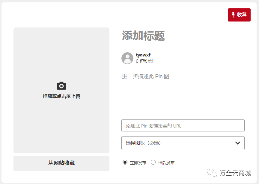 账户建立完成,我们就需要开始上传我们的产品图片,并完成产品标题、描述、URL、boards分类的编辑。