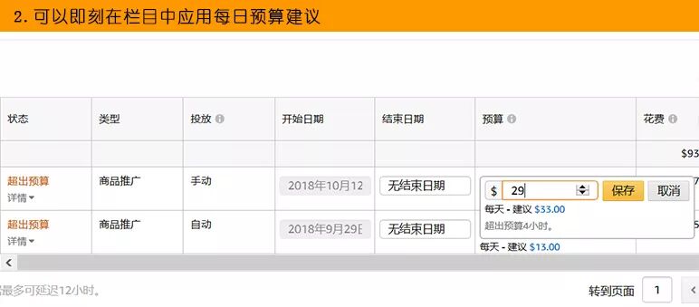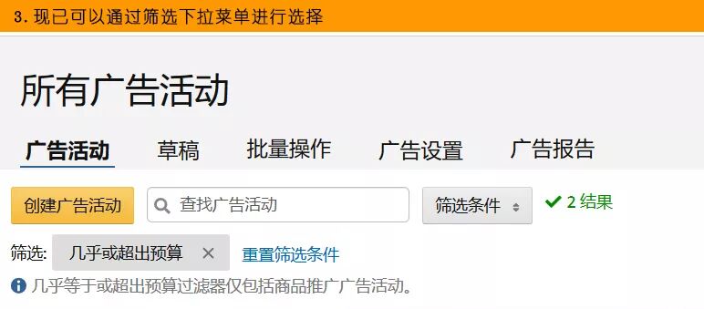 此外,广告活动管理页面会显示预算提醒、预算建议,还能通过筛选器选出即将超出预算的广告活动,及时调整预算,有效避免广告活动超出预算的情况出现。