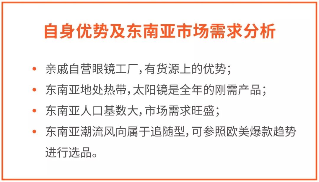 后来Kevin接触到了Shopee。Shopee针对东南亚和台湾市场,目前还是处于流量红利期,或许是进行太阳眼镜跨境销售的最佳选择。于是他结合自身优势和东南亚市场环境进行分析: