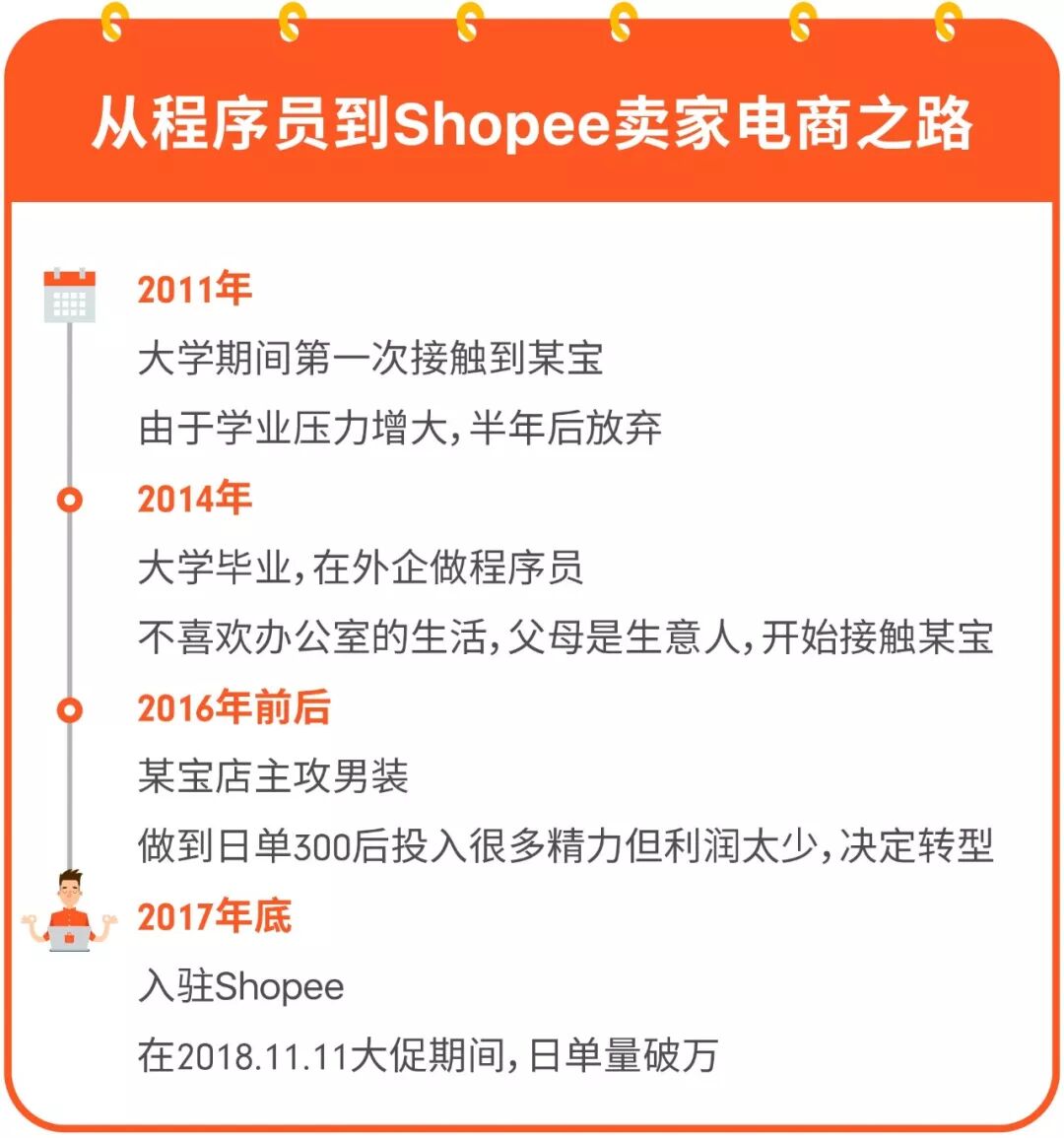 Kevin之前是一名外企互联网程序员,后转型进入电商行业成为一名内贸卖家。两三年内遭遇瓶颈,选择Shopee平台进军东南亚顺利完成转型,业绩开始直线上升。