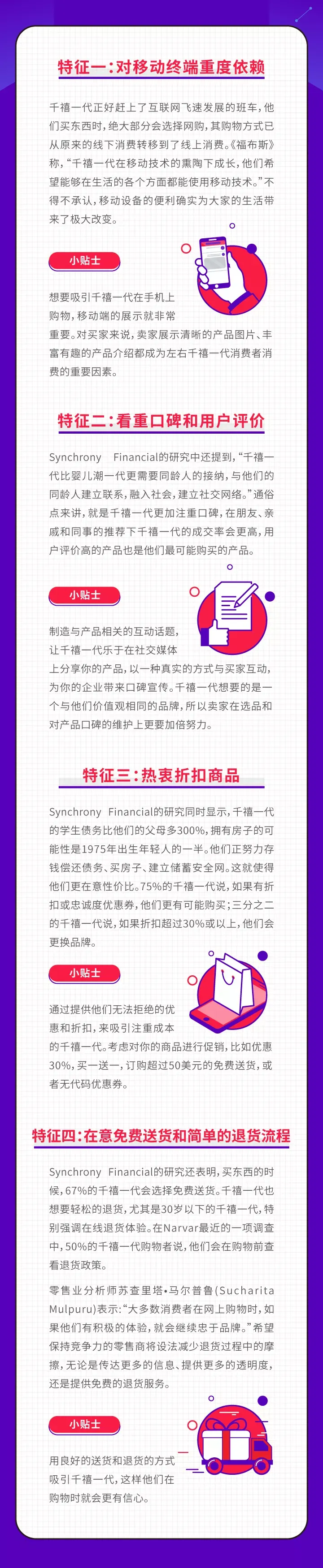 千禧一代是指出生于1980年到2000年之间 是目前世界上最大的购物群体 据埃森哲(Accenture)数据显示,单美国就拥有7540万的千禧一代人口,且每年花费6000亿美元。还有预测表明,再过20年左右千禧一代的花费将上升到1.4万亿美元。光看数据就能感受到千禧一代是个十分庞大的消费群体,伴随着互联网的日渐普及和消费能力的提升,跨境卖家若能在千禧一代这一市场中站稳脚跟,那未来的销量数据也将十分可观。 为吸引更多千禧一代前来消费购物,沃尔玛也做出一系列应对措施,在其网站上新推出户外活动用品商Moosejaw,Moosejaw是一家相对高档的零售品牌,在2017年就被沃尔玛收入旗下,其商品种类涵盖了Patagonia、Canada Goose等品牌的产品。 沃尔玛还收购了男性服装公司Bonobos及女性时装配饰公司ModCloth,并且还与Lord&Taylor达成交易,并会在网站上为其开设用来销售高级品牌的时装区,这一些列举动也证明沃尔玛正逐渐步入高档货品零售市场,企图通过为消费者创造更多消费选择来吸引顾客消费。 作为老牌电商平台,沃尔玛的消费者肯定不会少,但仍然为吸引更多顾客不断做出努力,那么作为跨境电商卖家的我们,又该如何引起千禧一代的关注?经验表明,想征服这一庞大的消费群体,还得根据千禧一代的特征入手。 看完了这么多“套路”,相信大家已经有自己的计划了吧。 *部分信息、图片来源于网络