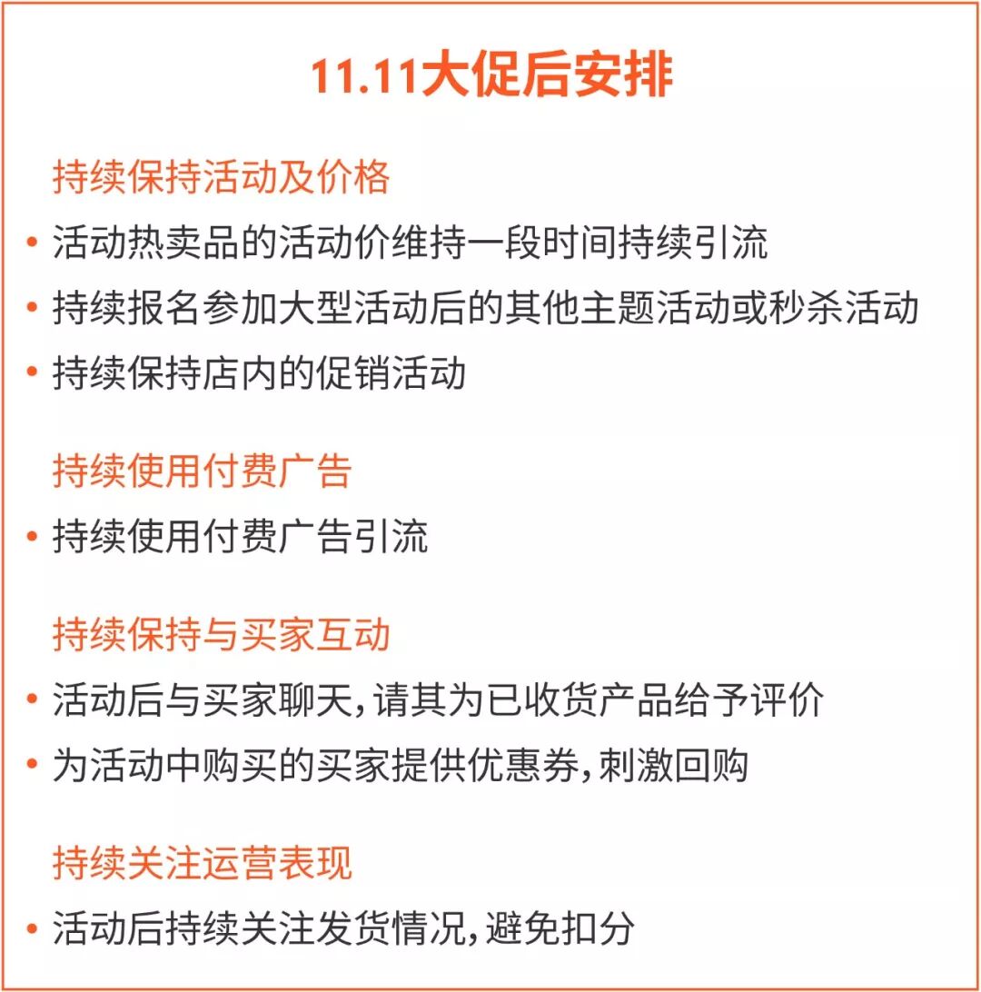 11.11过后,活动热度还在延续,返场促销活动将订单高峰延续,卖家应该如何抓住流量的尾巴呢?需做好以下几步: