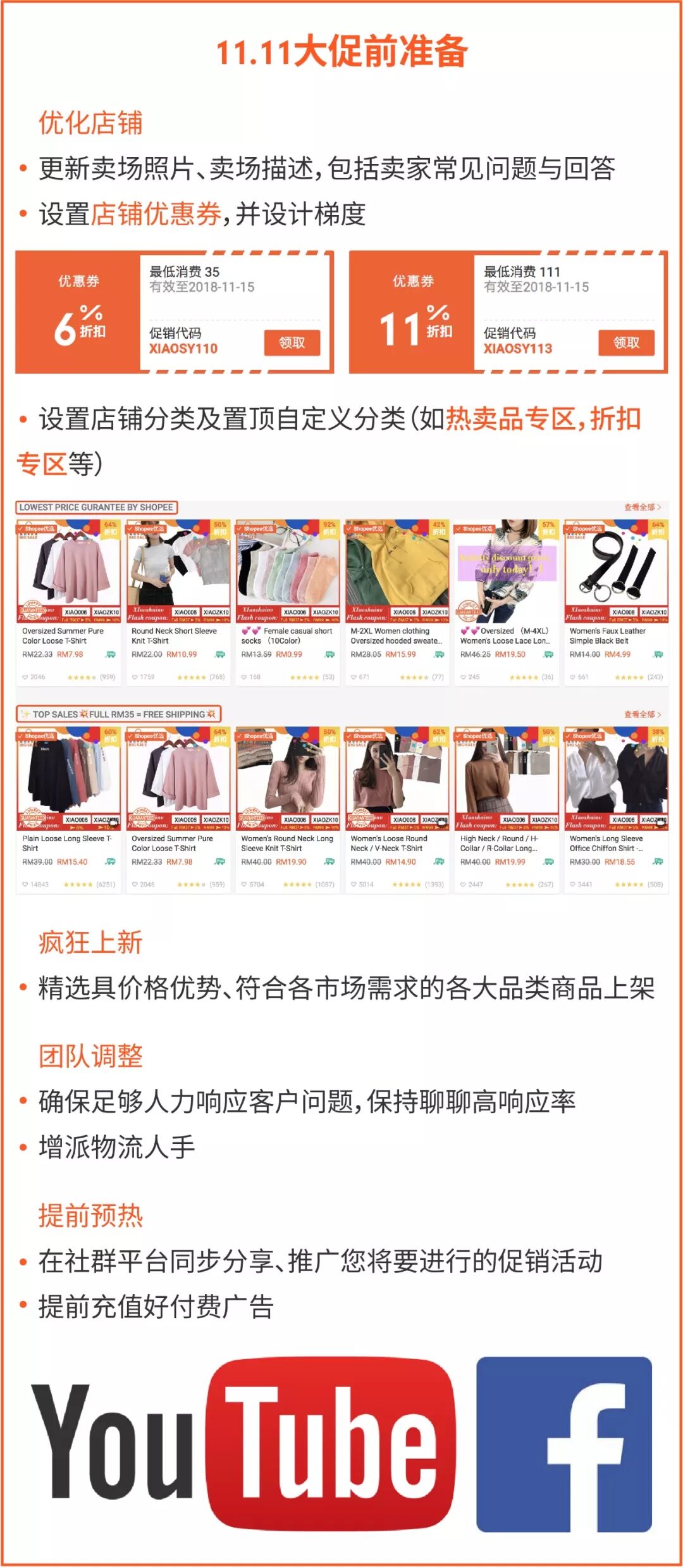 Shopee运营经理总结了以下致胜运营细节,帮助各位卖家做好最后冲刺!除了优化商品,11.11活动前期还要做好优化店铺、大量上新、团队调整、提前预热四个工作。具体怎么做呢?快来看看吧~