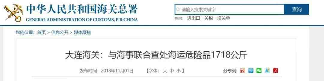 10月31日,大连海关与大连海事局联合对外发布消息,双方利用“三互”联合研判机制,联合查处出口危险品漂白剂瞒报案件,查处货物共计1718公斤。