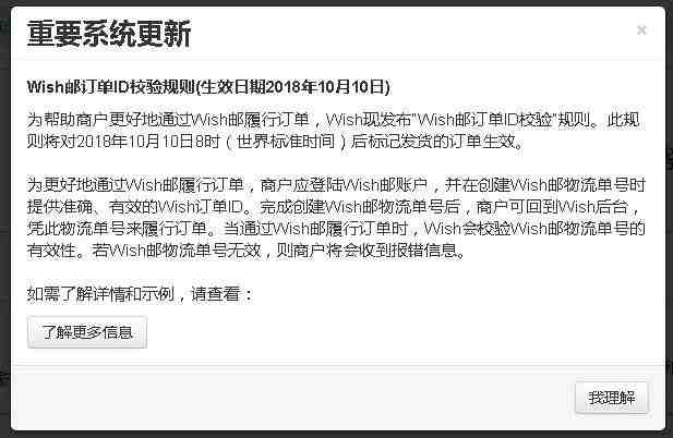 wish公告:为帮助商户更好地通过Wish邮履行订单,Wish现发布“Wish邮订单ID校验”规则。此规则将对2018年10月10日8时(世界标准时间)后标记发货的订单生效。