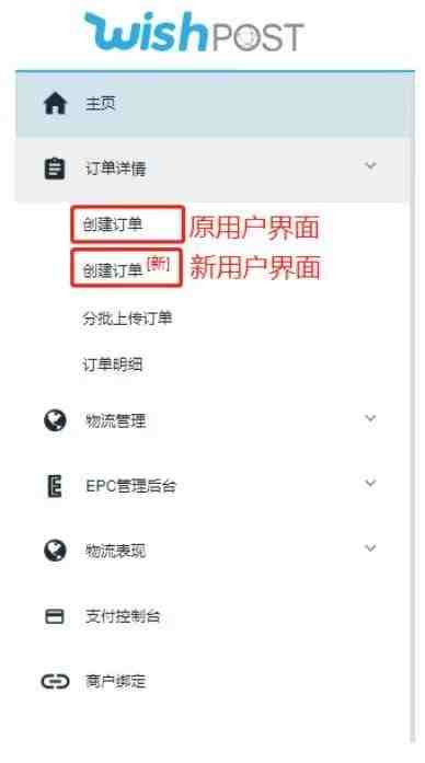 登陆Wishpost界面,点击菜单的”创建订单”或“创建订单【新】”均可申请物流运单;