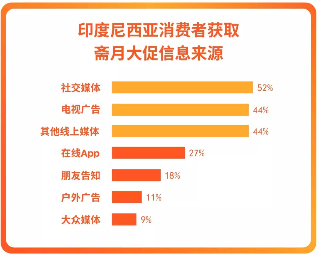 印度尼西亚消费者主要从哪些渠道获得电商促销信息呢?研究表明,大多数消费者主要从社交媒体及电视广告获取斋月大促信息,多达52%的消费者从Instagram、Facebook、Twitter和YouTube等社交媒体上了解斋月促销相关信息;44%通过电视广告了解。