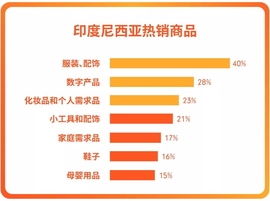 2018年印度尼西亚最热销的商品是什么呢?服装、时尚配饰一直是最热门的品类!以斋月为例,Snapcart研究显示40%的受访者购买了服饰商品;28%购买了游戏、付费应用及保险等数字产品;其次为化妆品和个人需求品、小工具和配饰、家庭需求品、鞋子、母婴用品等。这些也是Shopee旺季的热推商品~