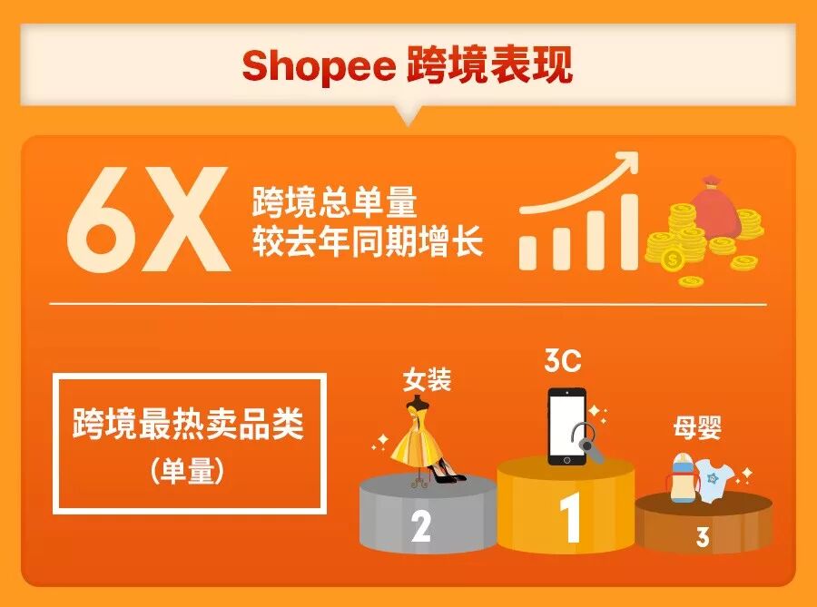 今年中国跨境卖家在9.9购物节中表现非常突出,跨境总单量较去年同期实现约6倍增长的惊人纪录,涨幅跑赢大盘!其中,3C、女装和母婴产品是Shopee跨境总体交易最热卖的三个品类。