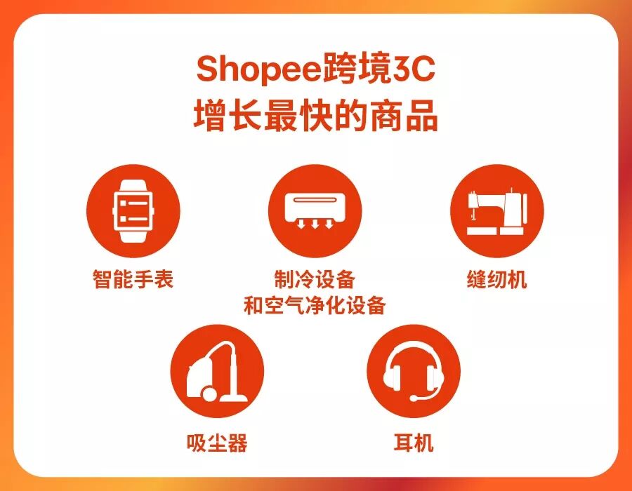 Shopee跨境的3C电子产品增速迅猛,日单量在平台整体占比飞速提高。其中,增长最快的Top 5子类目是智能手表、制冷设备和空气净化设备、缝纫机、吸尘器、耳机。