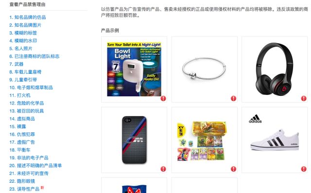通过商户平台帮助菜单的“品牌大学”,我们可以直接查看禁售品理由。我们发现上图禁售理由中的“知名品牌仿品、知名品牌图片、已注册商标的团队标志、名人照片”等等都是仿品侵权。所以识别仿品、规避仿品非常重要。