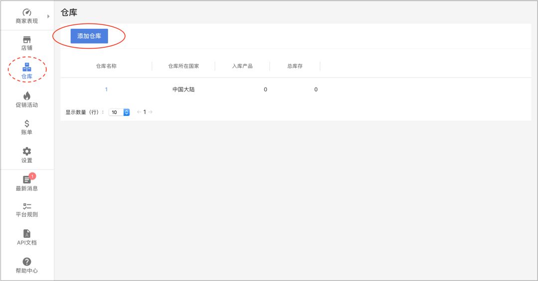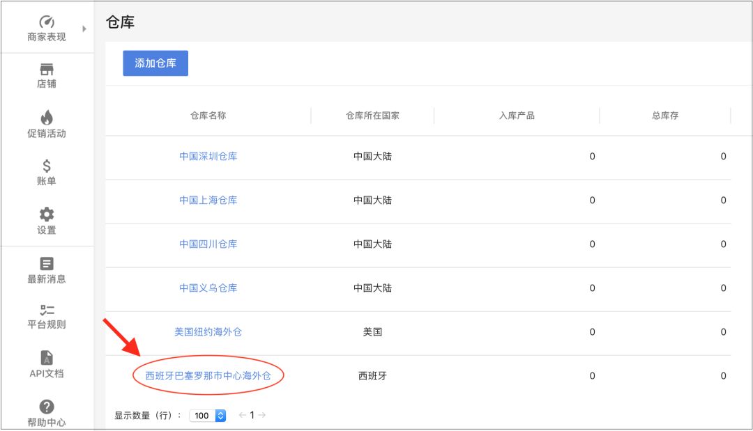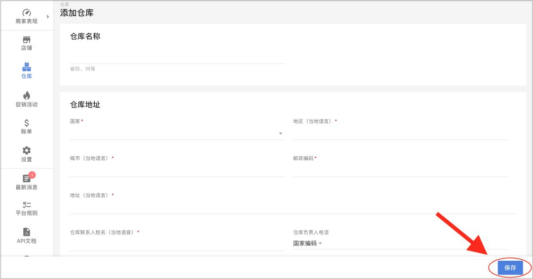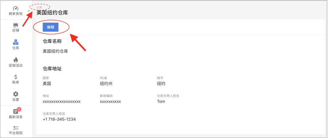 添加完新的仓库后,卖家可以点击页面上方的“仓库”回到主界面,或者是编辑新添加的仓库的相关信息,并保存更改。