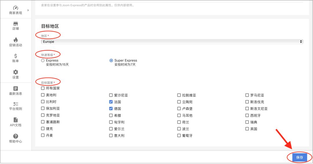 设置目标地区、国家以及快递等级