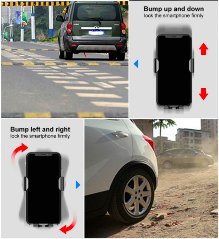 1)如在路面不平的情况下,展示产品如何有效地自动调整来减轻手机的晃动,避免跌落