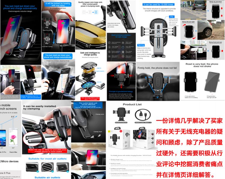 3)因此在车载无线充电器选品的时候,卖家们可以优先考虑支架式充电器,在制作详情的时需要结合行业痛点解决买家可能存在的所有疑问,并配以精确的图片加以表达,为买家营造良好的消费体验。