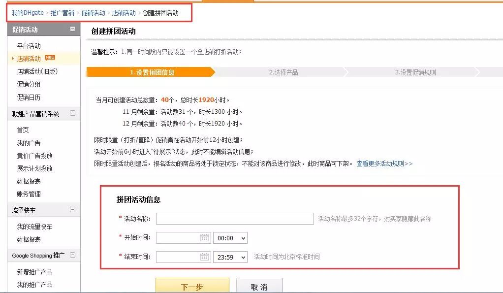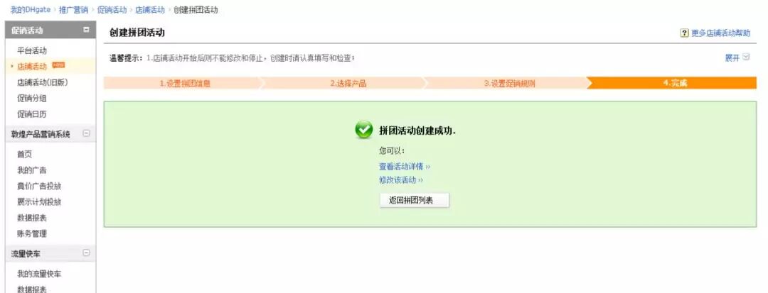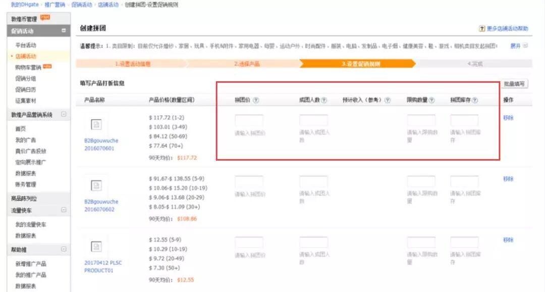 我的dhgate——推广营销——促销活动——店铺活动——拼团