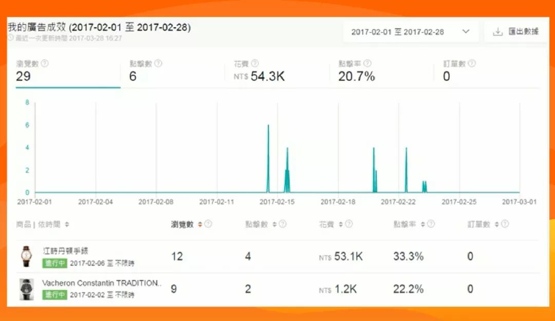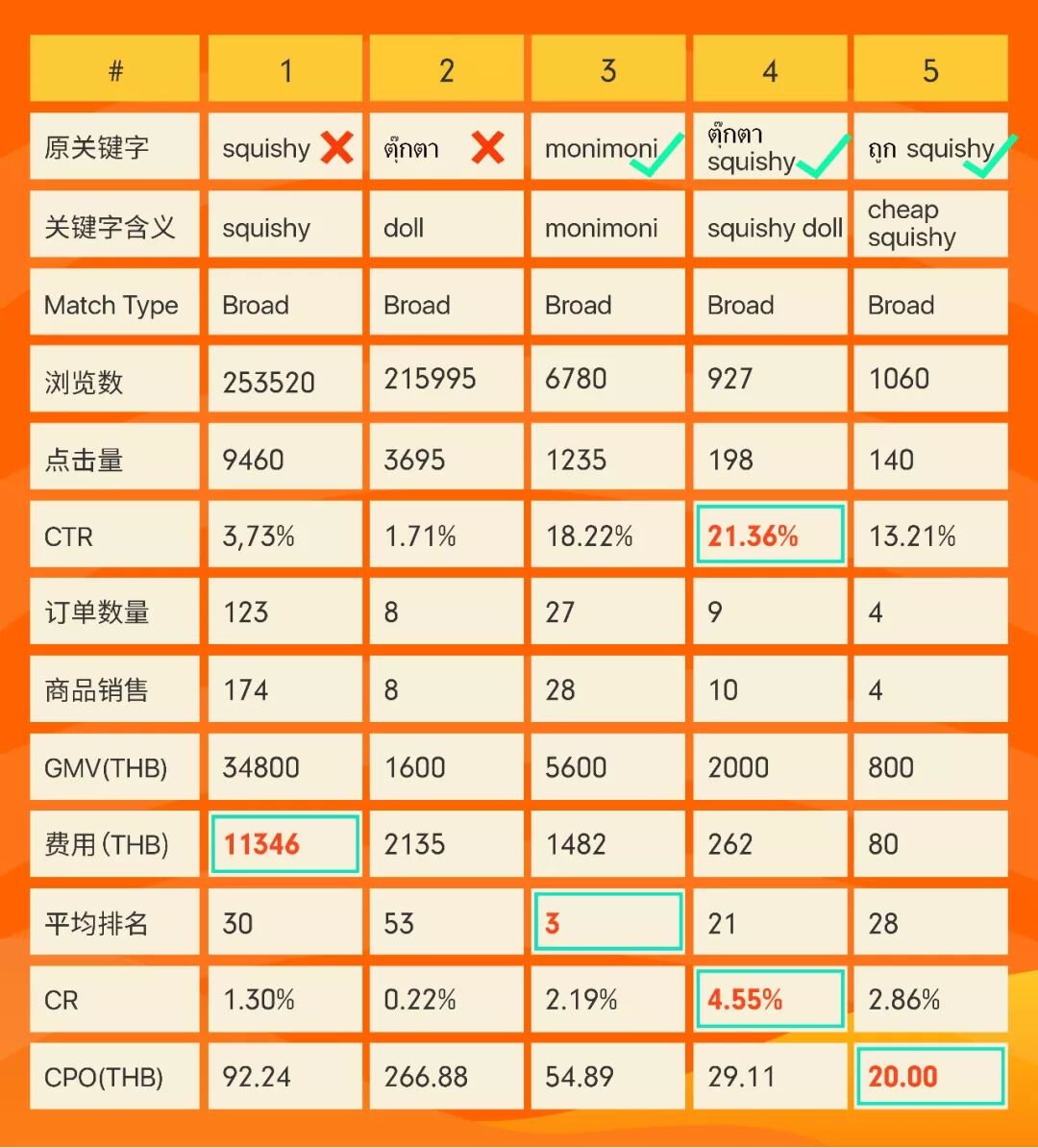 重点来了!下面用案例为您讲解如何根据报表优化商品。以泰国站某一产品为例(一套Squishy 9个; 200THB),以下是5大关键字的表现: