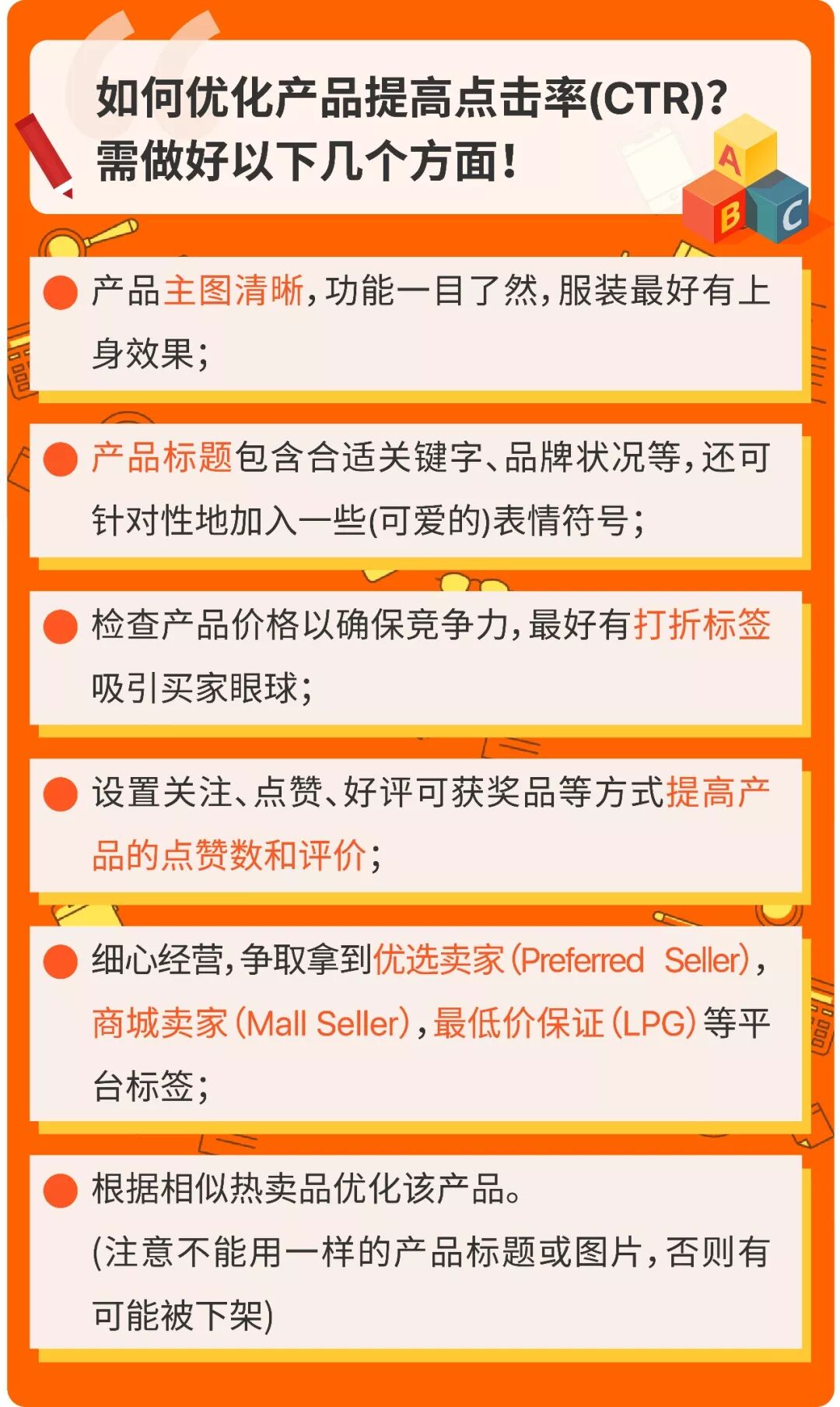 买家透过搜索,会有很多相关产品弹出,只有被点击才有被购买的可能~那么该如何让买家对你的产品一见钟情呢?我们需要对商品进行优化,吸引买家进行点击。