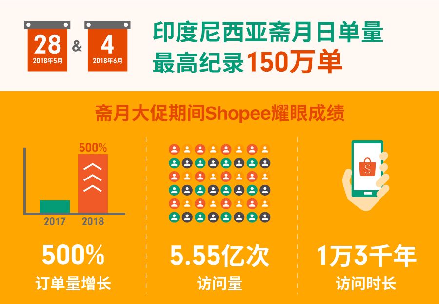 今年Shopee斋月大促再度席卷整个印度尼西亚,开创多项纪录!大促期间,平台订单量较去年斋月期间增长超过500%,其中5月28日和6月4日的日单量均达到150万单,涨势迅猛!平台访问量达5.55亿次,所有的访问时长合计突破1.3万年,当地消费者一打开Shopee就刷个不停,开启买买买剁手模式~